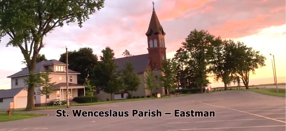 In 1856 ten Catholic families lived in Eastman.It is a historical fact that the Holy Sacriface of Mass had been offered in private homes prior to the time the first church was built. In the year 1873 Frank Honslik & John Rohlik donated 4 acres of land south of the village of Eastman for a church site. The Church was in construction for 10 years. The first Mass was held June 15, 1884. the first Rectory was built in 1898, and burned in 1916, rebuilt in 1917. In the history of the church there were 2 fires; July 1906 a lightning bolt started a fire that gutted the building. The congregation rebuilt and a second fire destroyed the church on Christmas Day 1917, leaving only the orignial stone walls. The present church was constructed immediately following the fire, utilizing what remained of the original stone strucure. Mass was held Christmas Day, 1918. (Eastman Village, Town and Area, published 1969)